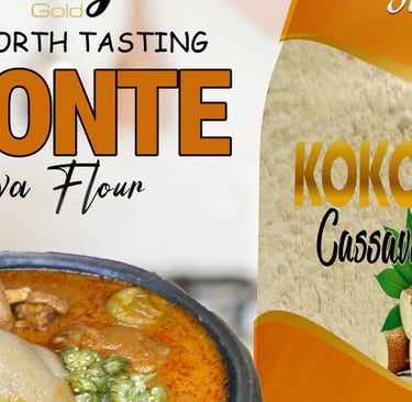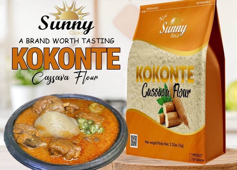 Best served with groundnut or palmnut soup, Kokonte is a staple in many Ghanaian households. Enjoy the rich flavor and texture of Kokonte with your favorite soup. Sunny Gold Kokonte Powder is packaged in sachets of 1.0kg, 2.27kg, 4.50kg and 9.07kg.