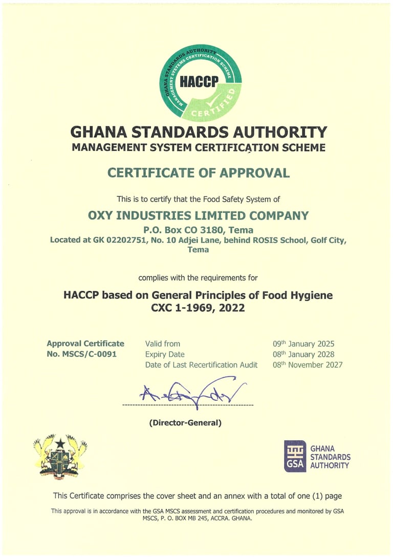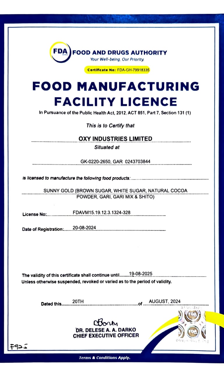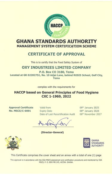 Official certification from the Ghana Food and Drugs Authority confirming our facility's compliance with national food safety and quality standards.
