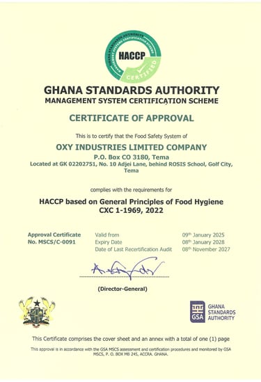 Today, Oxy Industries is a leading food processing and packaging company in Ghana, renowned for our commitment to quality, safety, and customer satisfaction. Our story is one of passion, dedication, and a relentless pursuit of excellence. We are proud to be making a difference in the lives of our consumers and contributing to nation building. We look forward to continuing to innovate and improve for years to come.