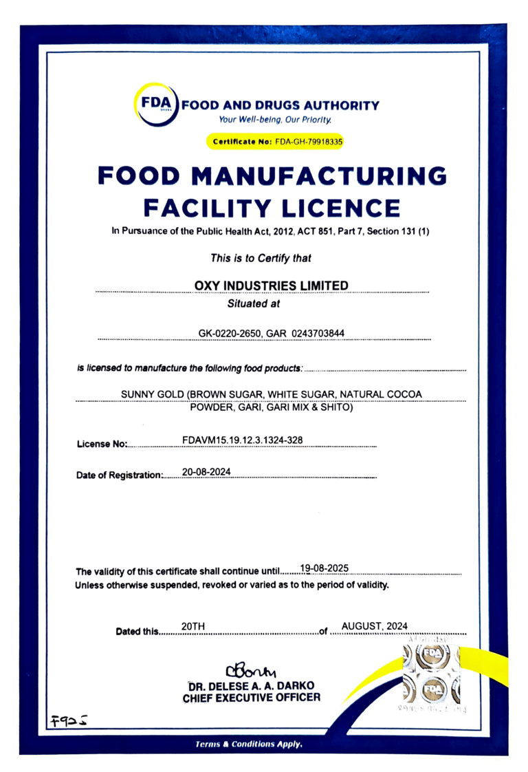 Official certification from the Ghana Food and Drugs Authority confirming our facility's compliance with national food safety and quality standards.